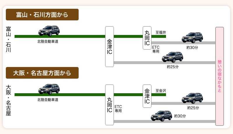芦原温泉駅から東尋坊、雄島、三国の古い町並み、越前松島水族館などの観光に便利です。